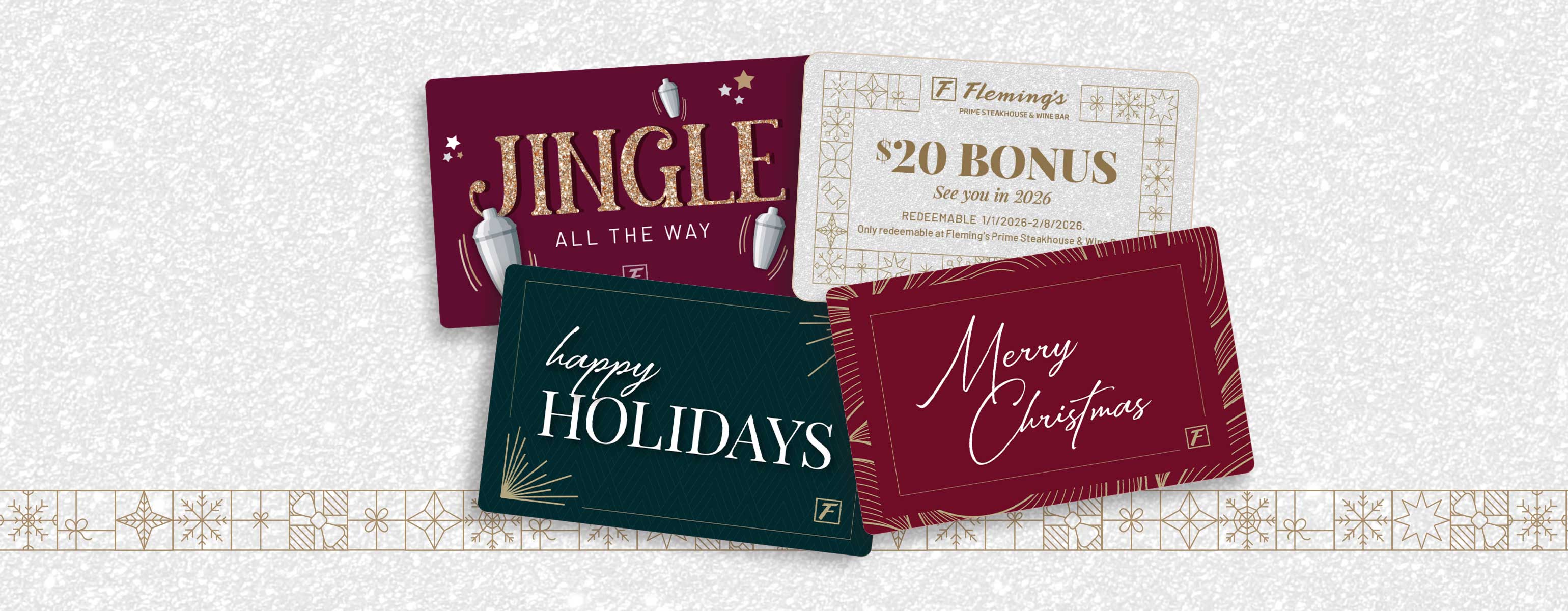 *Purchase $100 in gift cards 11/10/2025 - 12/31/2025 and receive a $20 bonus card valid 1/1/2026 - 2/8/2026 ONLY and is a limited time offer, while supplies last. THE $20 BONUS CARD IS NOT A GIFT CARD. Valid at any Fleming’s restaurant locations in the United States. Bonus cards cannot be used for gratuity, taxes, and alcoholic beverages. No cash value. No replacement value if lost or stolen. One time use card will not carry an unused balance. No reproductions will be accepted. Price and promotion may vary. Not valid with any other discounts or offers including Family Bundles or any Dine Rewards redemption. Not valid for Private Dining events or for Catering orders. Not available for prepayment online. To prepay, call your local store. Not redeemable at airport locations, Aussie Grill locations, and through any third-party delivery service.