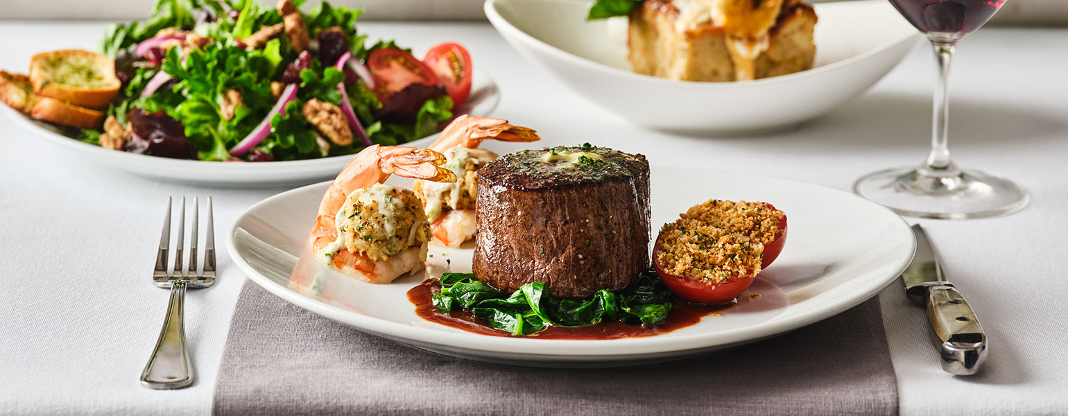 Make the effort of going out worth your while with our Land & Sea 3-Course. Start with your choice of salad or soup. Follow with our tender Filet Mignon & Crab-Stuffed Shrimp, served with sautéed spinach, parmesan crusted tomatoes and port wine demi-glace. Then indulge in our Bananas Foster Bread Pudding, finished with rum caramel sauce and vanilla ice cream. Available nightly for a limited time starting February 18.