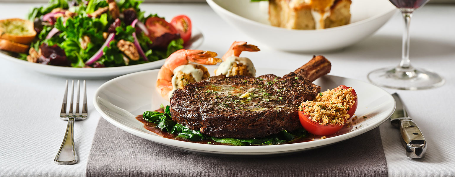 8 oz hand-cut Filet Mignon, sautéed spinach, parmesan crusted Campari tomato, port wine demi-glace xxx cal - Prime Bone-In Ribeye** & Crab-Stuffed Shrimp | 82