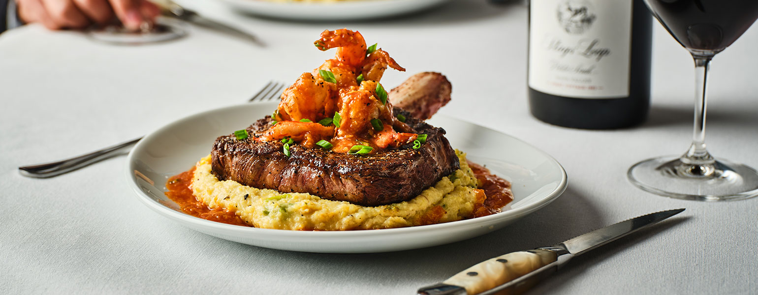 6 oz filet mignon*, jumbo shrimp glazed in New Orleans-style BBQ butter, served over cheesy polenta 1360 cal